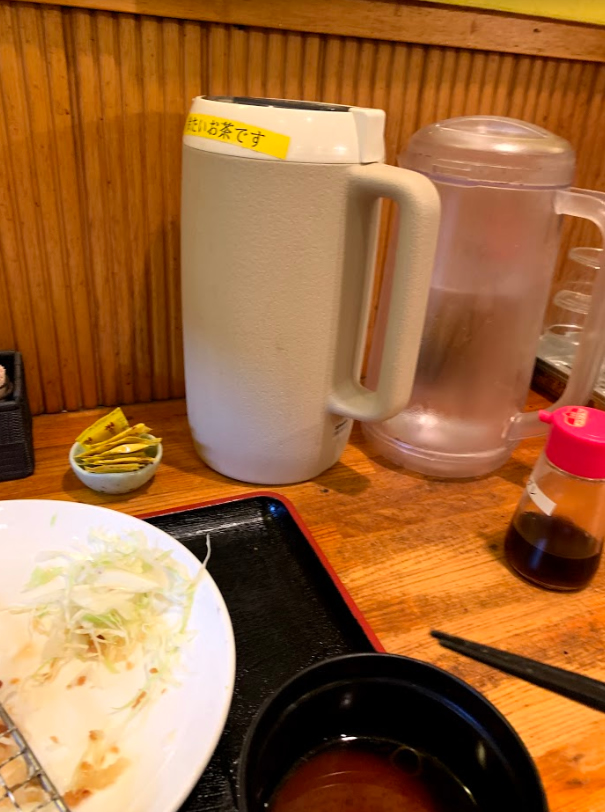 明治亭さんでは「水」と「冷茶」が置いています、たぶんこの店くらいかもしれないです。