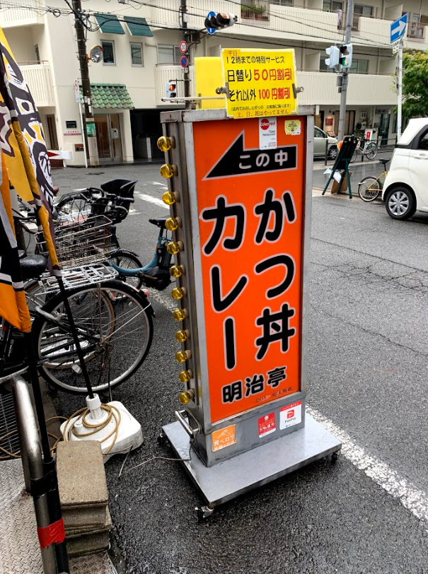 名前は明治亭、古きよき時代感が出てるのと、普通に美味しいです。看板も「カレー・カツ丼」、もう「ごちゃごちゃ言う奴来なくていいから」感がしっかり出てます。