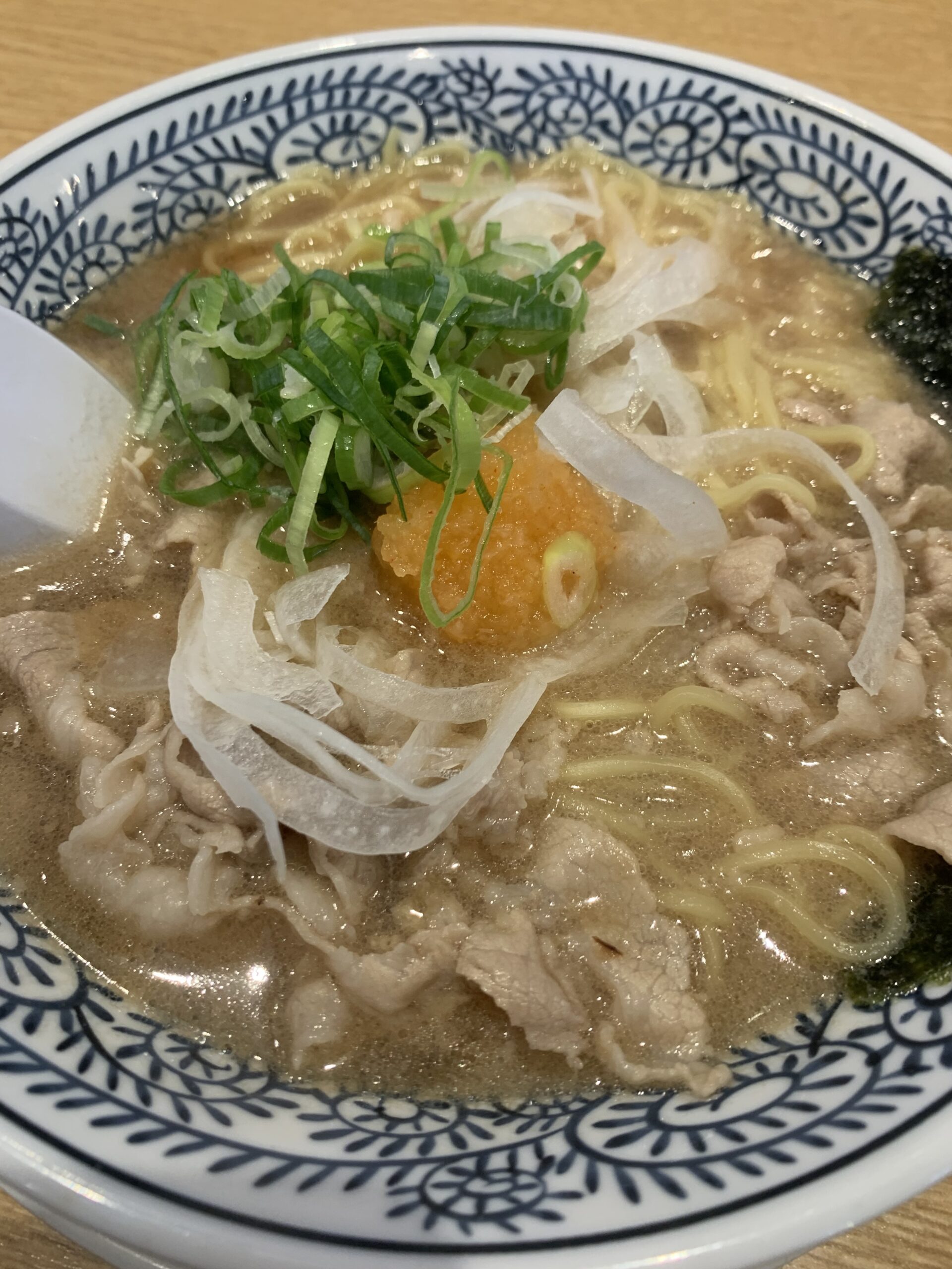 田辺警察署超えて、ユニクロの隣くらい看板が目立つ丸源ラーメンさんの肉そばです。
