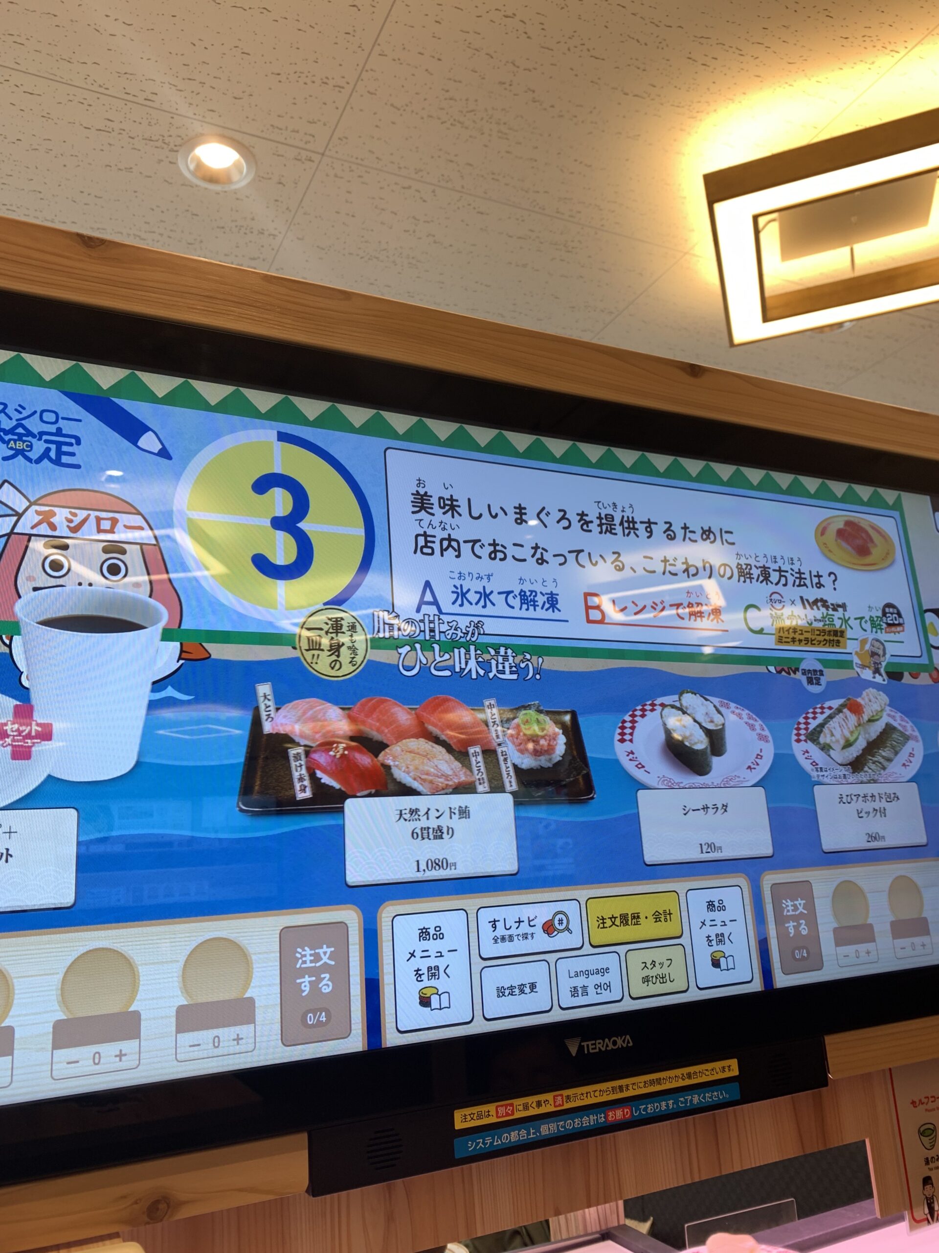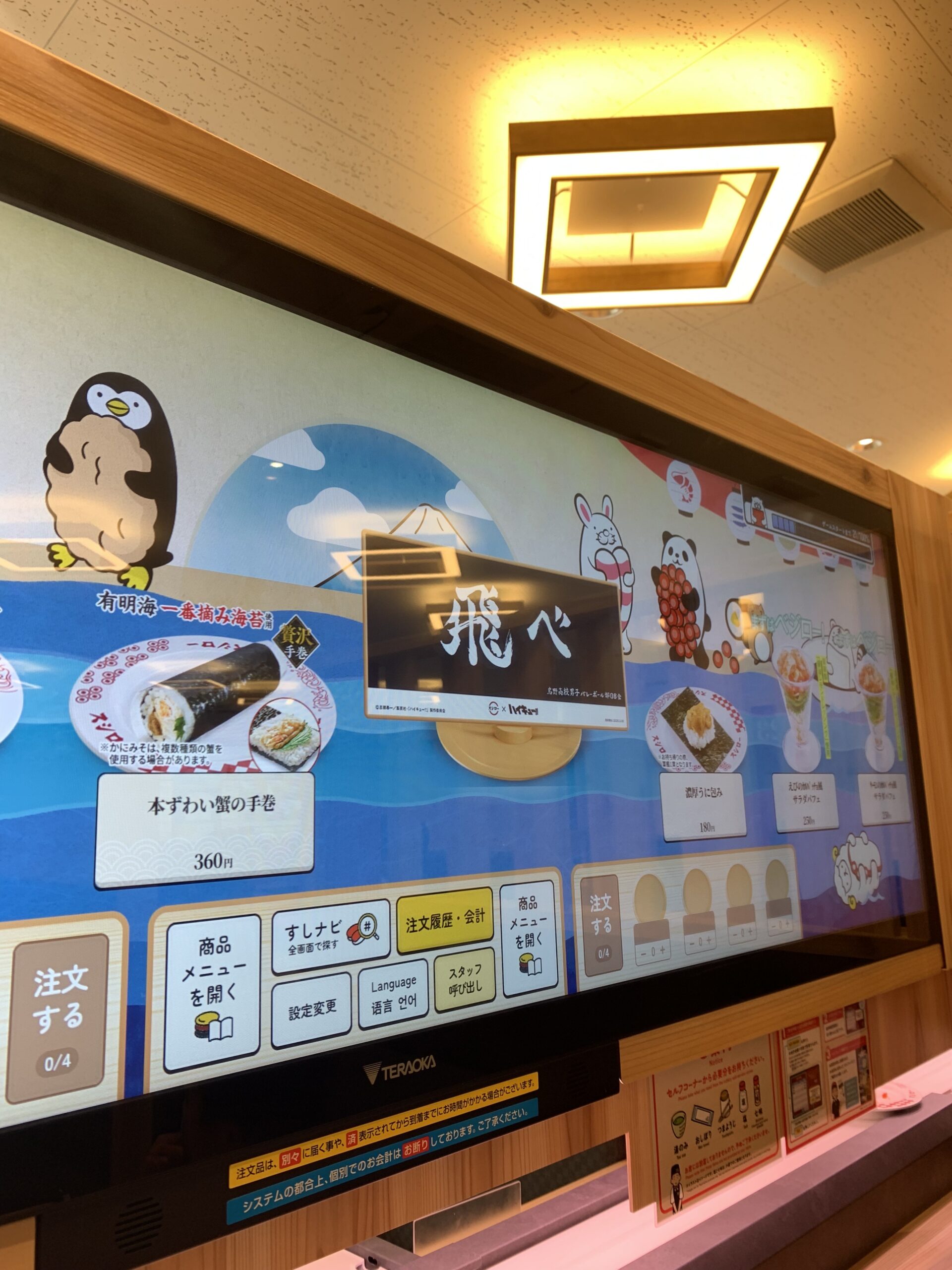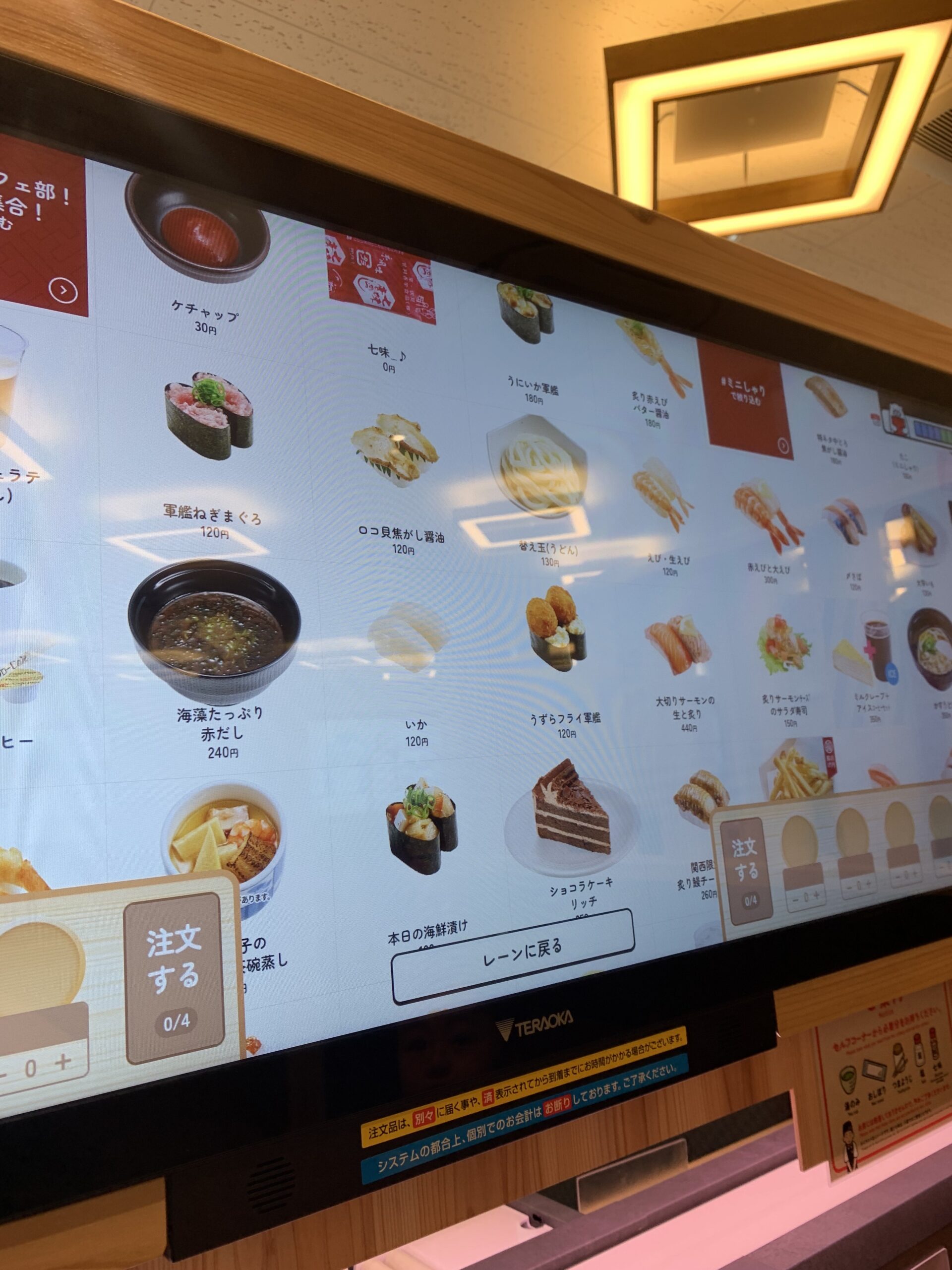 アイパッドみたいなやつでなくて、壁面一帯がタッチパネルになっててとても見やすくなりましたし、アイパットのタッチパネルだと取りあい喧嘩だったのが、このパネルだと机の右側と左側両方で操作できるので、喧嘩になることもぐっと減りました。さらに、データがスクロールで自動流れるので、今日のおすすめとか最新お寿司とか訴求力が高く、目にちらちら入るから購買力もあがるような感じがします。