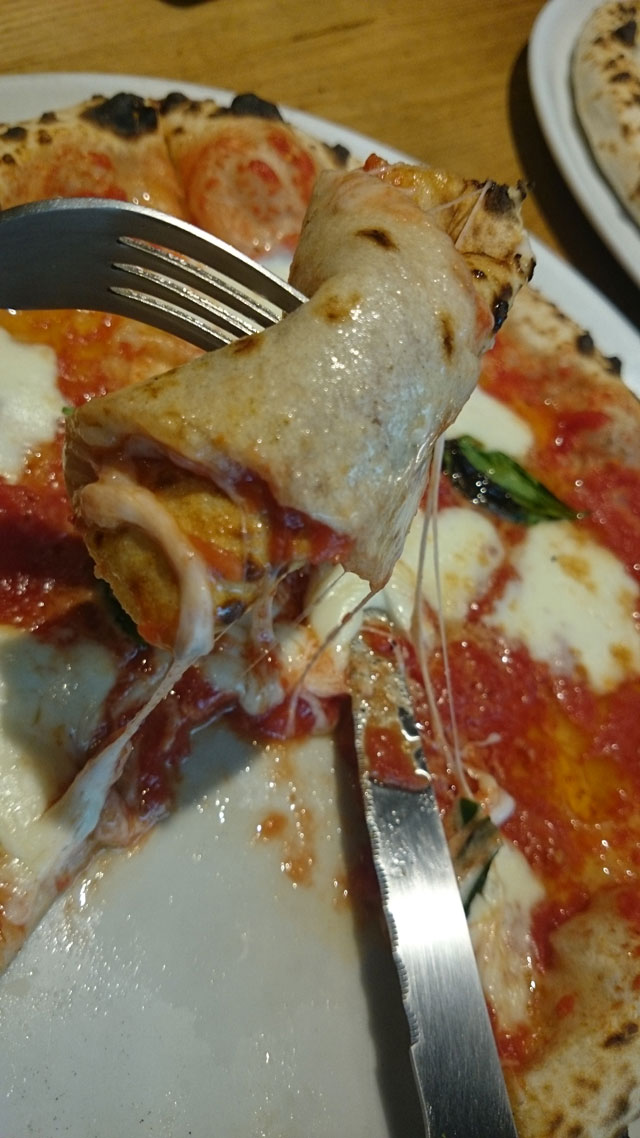 「ピザの中心にある、三角形の尖端の尖ったところから丸めて食べる」