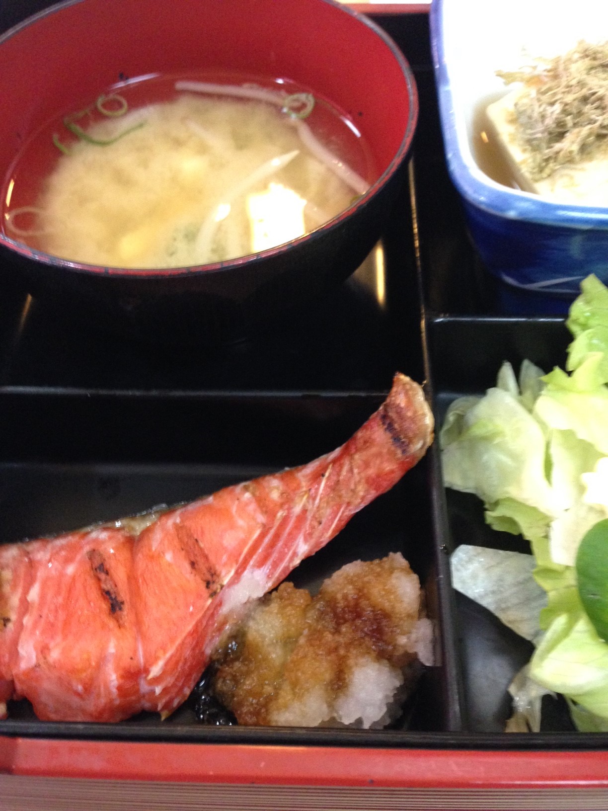 美味しい。味が1つ1つしっかりしてる、すごい美味しい。豚天と焼きしゃけに野菜、高野豆腐など。あとママさんがすごい元気!