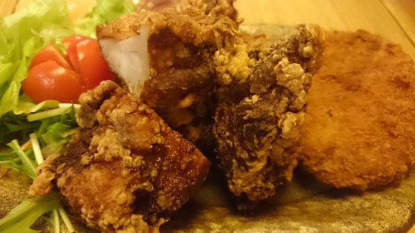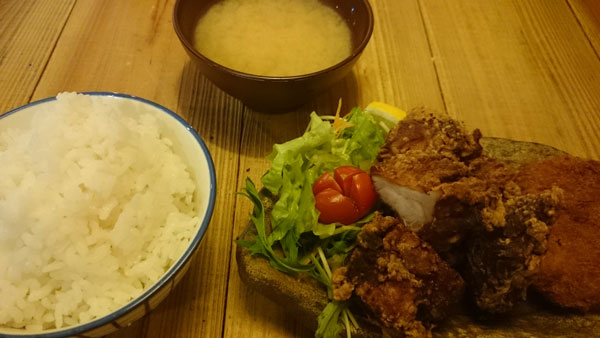 からあげにコロッケ、サラダ、味噌汁がついてます。