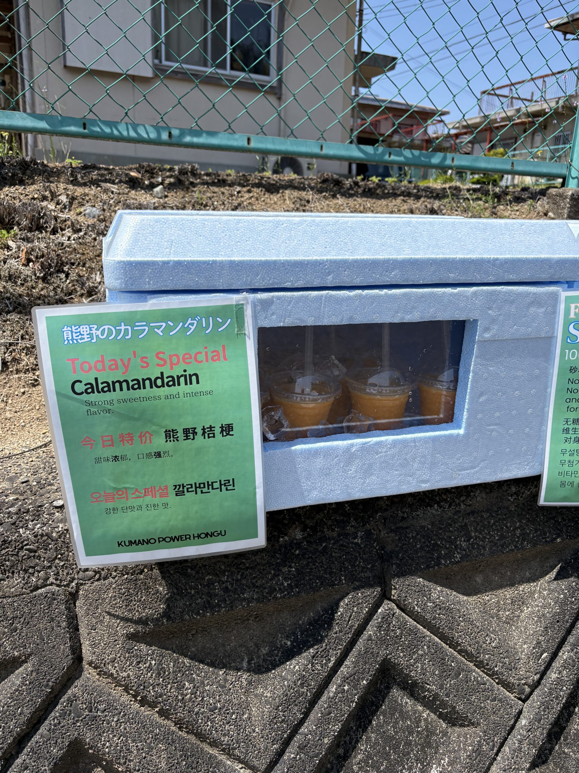 世界遺産熊野古道、そしてゴールの熊野本宮大社から100メートルくらい離れたところ、祓殿王子社のすぐとなりに売ってましたこの熊野カラマンダリンのスムージー。