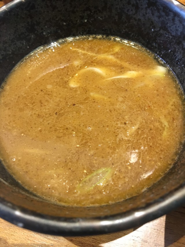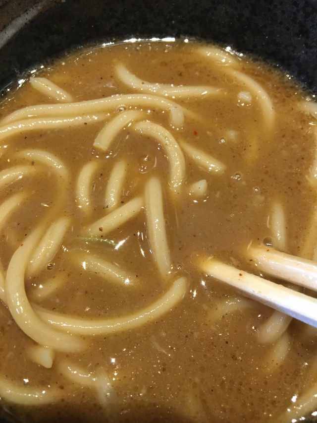 魚介豚骨系のつけ麺です。結構濃厚な魚介系スープ。1.5玉もありますが、今回は1玉。麺は太麺のつけ麺。