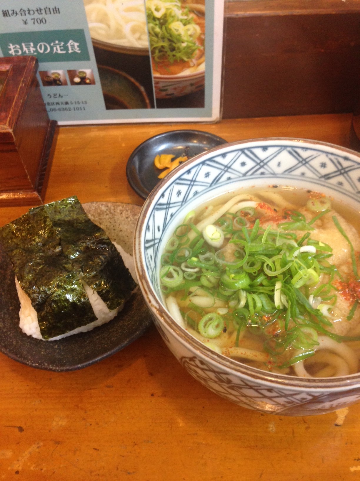 ところでうどん一さん、定食の色ごはんが1時30分くらいになるとほぼ確実に売り切れてしまってます、気をつけないといけません! それなら炊いておけばええんじゃないの?という外野、美味しい飯を提供する飯屋の主人のポリシー、メシポリシーを読んでください。そんなうどん一さん、いつものように色ご飯を空ぶったので、安定のおにぎり+きつねうどんに変更。うどん一さん、メニュー外のおにぎりになると、20円引きの700円定食が680円になります、こんなちょっとした気配りがいつも混んでる人気の秘密。