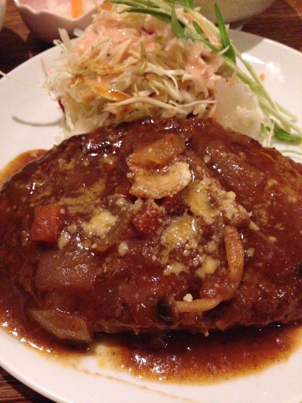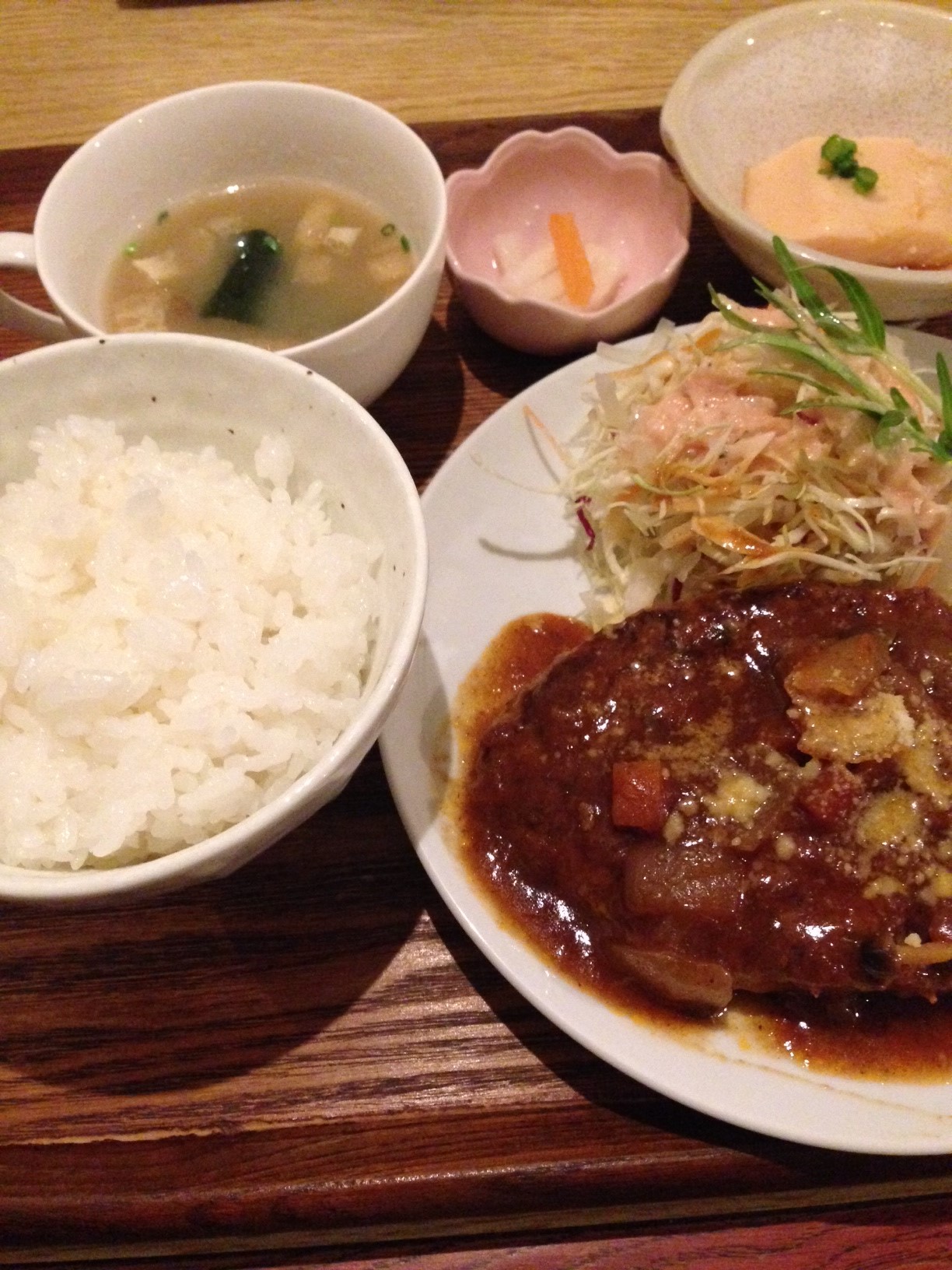 煮込みハンバーグ+小鉢+ごはん+つけもの+味噌汁 です。かわずさんは西天満の野菜創作料理店です。 季節の美味しい野菜はもちろん、旬の食材を使ったオリジナルメニューがいつも興味しんしん。
