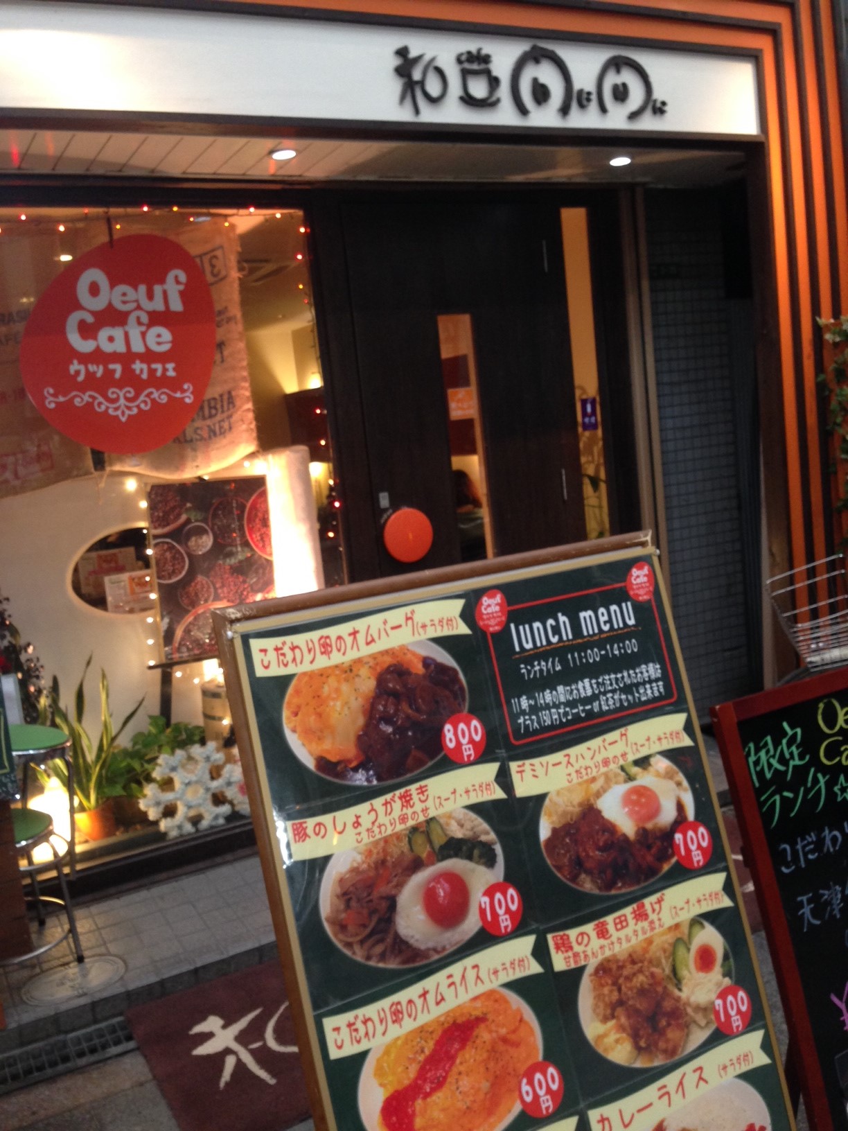 南森町駅で少し南、天神橋筋商店街の繁昌亭の近くの「Oeuf Cafe(ウッフカフェ)」さん。今回はオムライスセット。お洒落な外観と店内もおしゃれです。